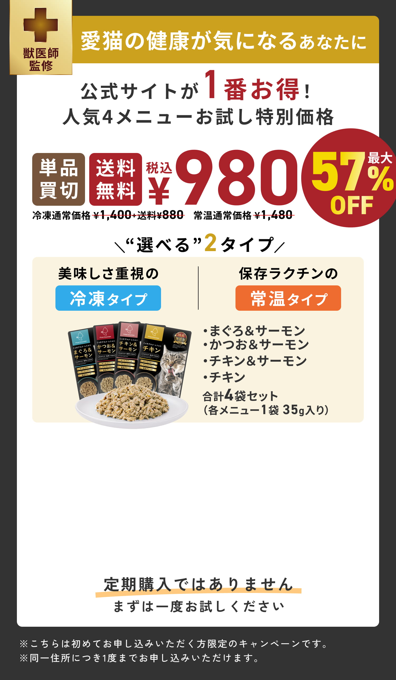 ネコちゃんの健康のため、ミャオグルメ(冷凍)は冷凍庫で保存する必要があります。