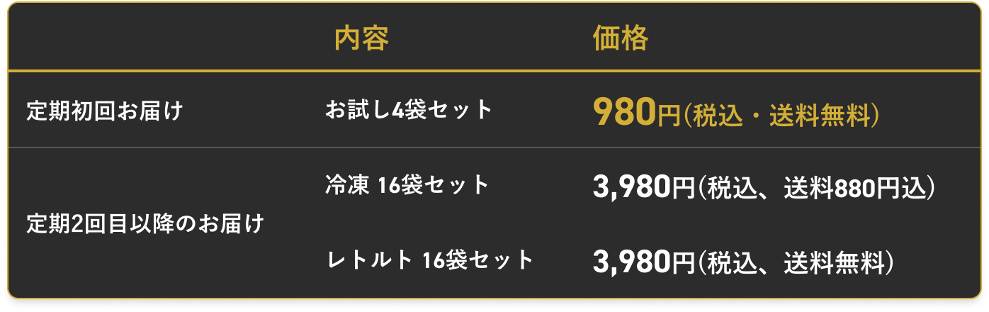 ※980円でお試しいただけるのは冷凍、レトルトのいずれかです
