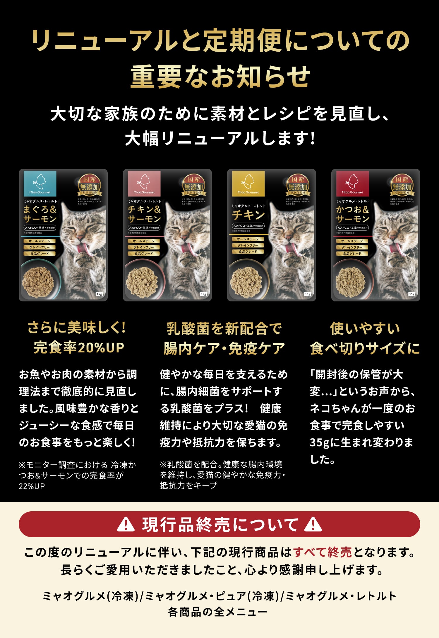 リニューアル品の定期購入をご希望の場合は、11月27日(木)以降にマイページやお電話にてお早めにリニューアル後のミャオグルメの定期便のお申し込みをお願いいたします。