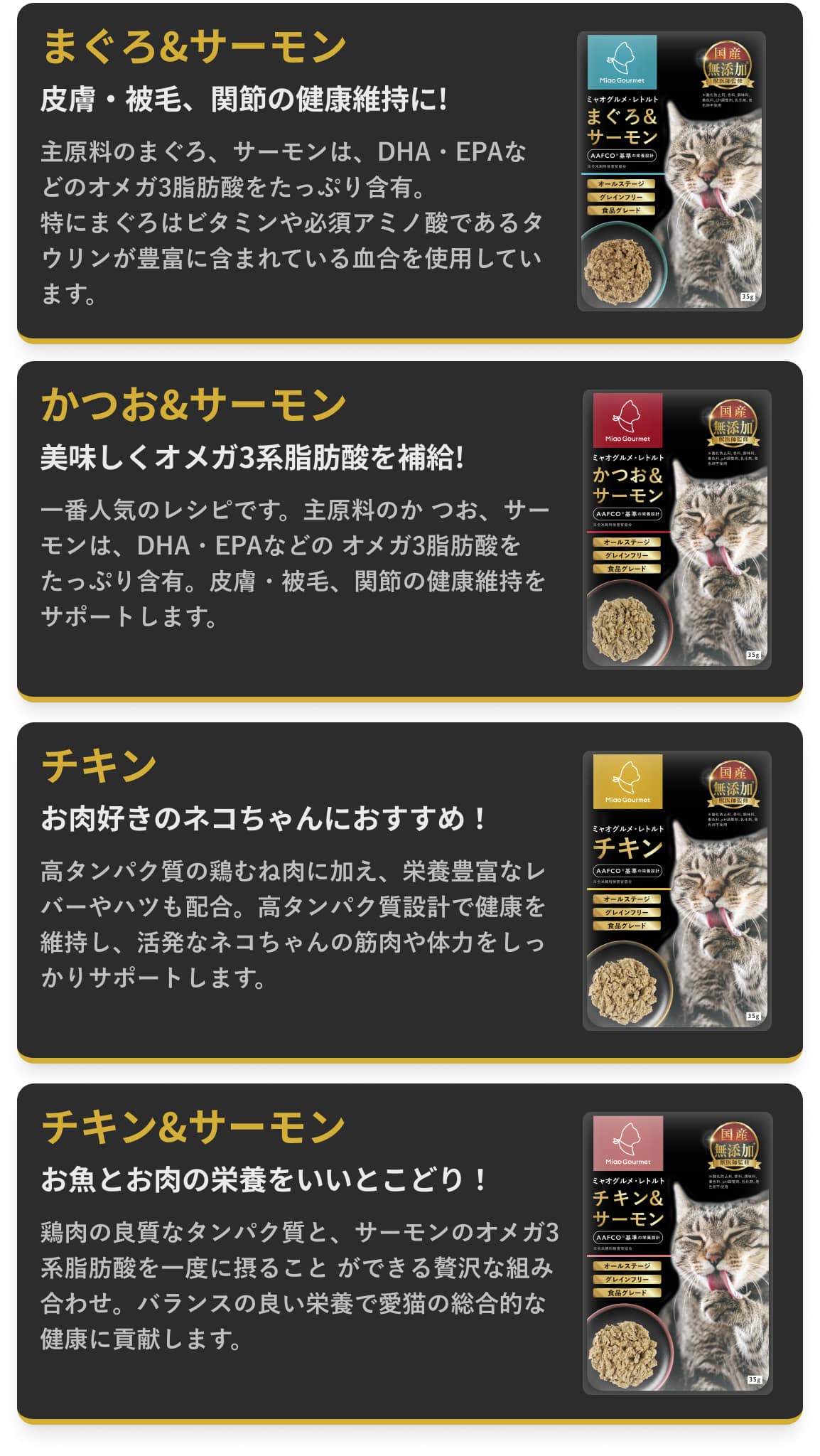 | ミャオグルメ・レトルト(常温) | 定期 | 12袋 | 4,980円 |